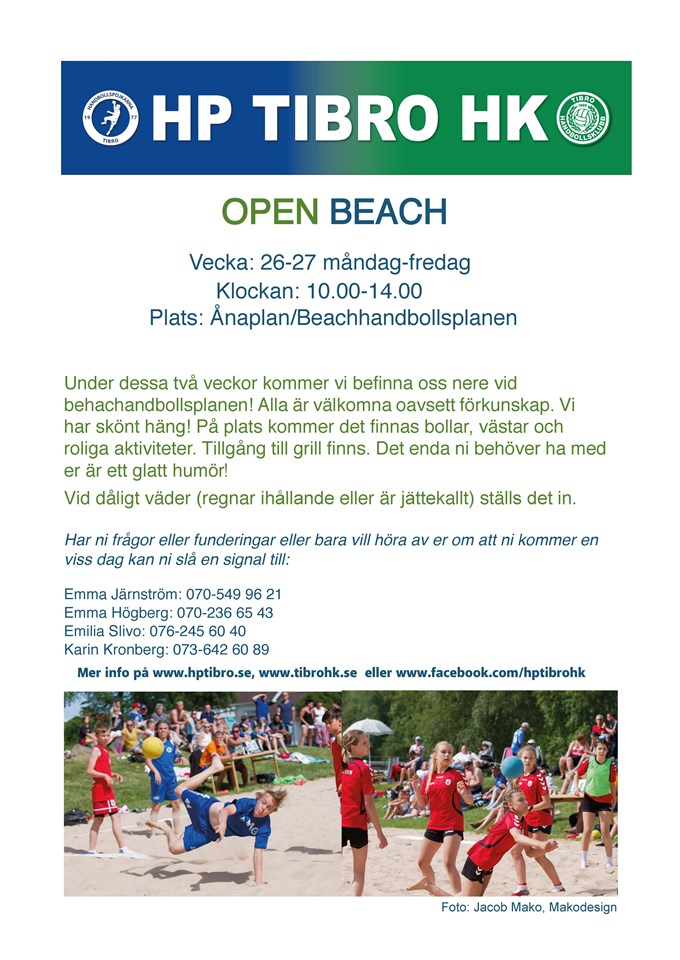 OPEN BEACH Vecka: 26-27 måndag-fredag Klockan: 10.00-14.00 Plats: Ånaplan/Beachhandbollsplanen HP Tibro 27 jun 2016 0kommentarer