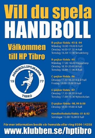 Alla lag har egna sidor som du hittar i rullisten uppe till höger! Seniorer A-lag Måndag 17.30-19.00 A-hall Onsdag 19.00-20.30 A-hall Torsdag 19.30-21.00 A-hall Tränare/ledare Fredrik Henriksson 0703-362860 Magnus Påhlsson 0702-050600 Hyveln Utv.-lag (-92 & äldre...) Torsdagar 21.00-22.00 A-hall Tränare/ledare Patrik Siren 0739-228368 Martin Björklund 0735-446295 B-pojkar -93 & -94 Måndag 18.00-19.00 B-hall Onsdag 16.00-17.30 A-hall Torsdag 16.30-17.30 Smuleberg Tränare/ledare Roy Sörensen 0702-713122 Dennis Pettersson 0735-079892 Helen Jacobsson 0762-966364 Lars-Ola Fred 0706-641719 B-pojkar -95 Måndagar 17.00-18.00 Häggetorp Onsdag 18.30-20.00 B-hall Torsdag 16.00-17.00 A-hall Tränare/ledare Gunnar Hedman 0709-472308 Johan Pettersson 0702-2681007 C-pojkar -96 Onsdag 17.30-18.30 A&B-hall Fredag 18.00-19.00 B-hall Tränare/ledare Bengt ”Putte” Dahl 0709-890540 Anki Broman 0733-767302 C-pojkar -97 Onsdag 17.30-18.30 B-hall Torsdag 17.00-18.30 Nyboskolan Tränare/ledare Marie Wiktorsson 0708-117386 D-pojkar födda 98, 99 & 00 START V.40 Onsdag 18.00-19.00 A-hall Tränare/ledare Jenny Svanqvist 0504-61515 Mattias Wiemann 0706-812299 Handbollsskola födda 01 & 02 START V.39 Söndagar 15.00-16.00 B-hall Tränare/ledare Tryggve Olsson 0706-473666 Kristian Lundh 0504-18477 En wordfil finns under dokument/diverse: HP Tibro översikt 08-09