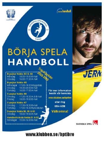 Använd de mallar som SHF har tagit fram och som finns för nedladdning på deras hemsida (se länk). Vi har tagit fram en HP Tibro variant som ni kan använda som ni vill, helt eller i delar (se bild). Eftersom den är för stor för att laddas upp så skickar du istället ett mejl till hptibro@spray.se och anger "skicka börjaspelahandboll" som ärende. Det är en .ppt på 2,58Mb. Affisher och flygblad från SHF Klicka på länken, Högerklicka på den du vill ha, välj spara som, öppna filen och lägg in den text som ni vill ha spara, skriv ut och dela ut!